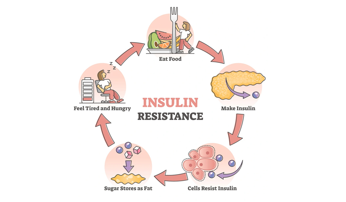 This is the underlying condition where the cells of the muscles, fatty tissue and liver stop responding as well to insulin. These cells can’t take up as much glucose from the blood. Initially the body tries to compensate for insulin resistance by making more insulin to maintain normal blood glucose levels. Over time the pancreas can’t produce enough insulin to overcome insulin resistance. This leads to high blood glucose and the development of pre-diabetes.